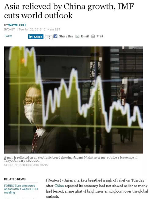 路透社1月20日报道称中国经济发展脚步放缓程度仍旧保持在预期范围内,并没有许多人想象中的那样严重,使得整个亚洲市场松了口气。