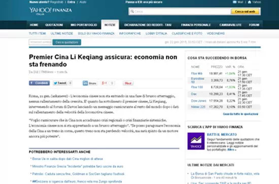 意大利askanews21日报道称中国国家总理李克强参加达沃斯经济论坛并发表讲话,向世界传达了一个令人放心的信息——中国经济不会进入硬着陆阶段,经济增长不会遭遇急刹车。