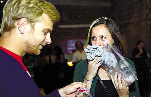 活动开始后,参与者一个接一个去闻异性放在密封袋里的衣服味道,然后选择自己喜欢的味道。整个过程有摄影师在旁边拍照“存证”。