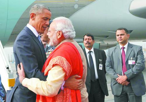 印度当地时间上午10时,美国“空军一号”专机飞抵新德里英迪拉·甘地国际机场。据路透社25日报道,莫迪当日违反印度外交常规,在寒冷的冬日早晨亲自去机场迎接奥巴马夫妇,并给了奥巴马一个热情的“熊抱”。按规定,外国领导人来访时,印度总统府会举行正式的欢迎仪式,总理一般不亲自去机场接机。按计划,25日下午1时30分开始,莫迪与奥巴马共进午餐,之后便是美印高级别会谈。共有3场会议将在两国政界、军界、商界间展开。印度媒体称,印度引进F-35战机,与美国联合生产无人机,印美防务合作升级的多项谈判已经完成,只等签字。法新社25日报道称,莫迪和奥巴马当天宣布,两国就打破民用核能合作僵局达成协议。莫迪在与奥巴马举行的联合新闻发布会上说,“我很高兴在我们签署双边协议六年后,终于有望在不违背两国法律和国际法定义务的基础上,开展双边合作”。奥巴马则表示,“我们在民用核领域合作上取得突破……这是显示我们能共同协作,增进关系的重要一步”。