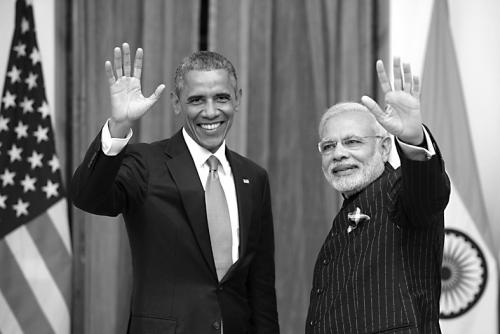 25日,奥巴马与莫迪在会谈开始前挥手致意。