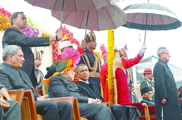 26日一早,薄雾伴着细雨,第66次印度共和国日检阅在新德里国王大道举行。上午10时,奥巴马的“野兽”专车在一长串护卫车的簇拥下缓缓驶来。随后,奥巴马夫妇被请上由防弹玻璃防护的主检阅台。这个特设的主检阅台只有不到10个座位,除了奥巴马夫妇和莫迪,只供印度总统、副总统及夫人就座。
