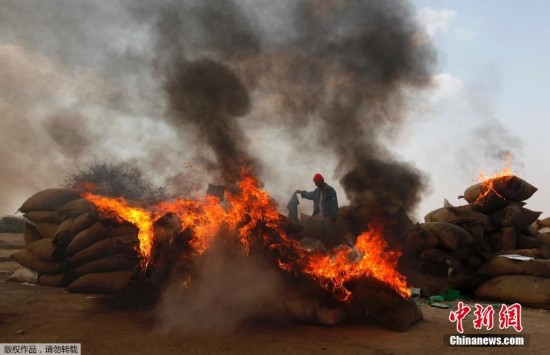 当地时间2015年1月26日,巴基斯坦卡拉奇,国际海关日当天,巴基斯坦当局焚烧和销毁约136公斤海洛因、89516瓶白酒、171262罐啤酒、假烟、过期药品等走私违禁物品。