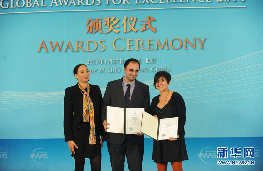1月27日,世界媒体峰会首届全球新闻奖在北京举行颁奖仪式。图为南非米瑞德集团M-NET首席执行官约莉萨·法赫莱女士(左一)为新媒体报道奖提名者颁奖。 新华网 陈竞超 摄
