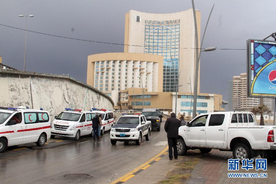 1月27日,在利比亚首都的黎波里科林西亚饭店旁,警方和红新月会的车辆停在公路上。新华社发(哈姆扎·图尔基亚摄)