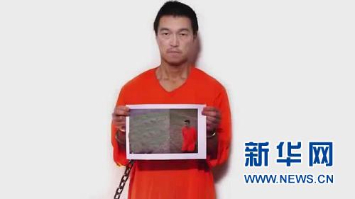 这张1月24日从互联网获得的图像显示,被绑架的日本人质后藤健二手持另一名人质汤川遥菜被杀害的照片(照片左侧画面已经过技术处理)出现在镜头中。 新华社发