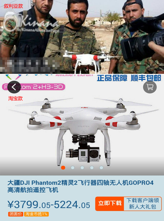 去年,叙利亚武装人员击落了一架遥控飞行器,并称这台飞行器来自政府军。这架多旋翼遥控飞行器,侧面有“Phantom”的字样,但在淘宝上搜索发现,这其实是一款中国厂商生产的民用航拍飞行器,淘宝价3000多元……