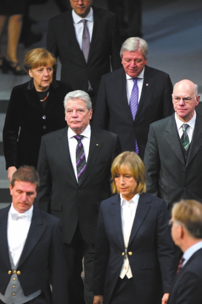 1月27日,在德国柏林国会大厦,德国总理默克尔(三排左)和德国总统高克(二排左)出席联邦议会特别议程。