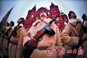 俄罗斯军人身穿二战时期苏联红军的制服参加阅兵仪式。
