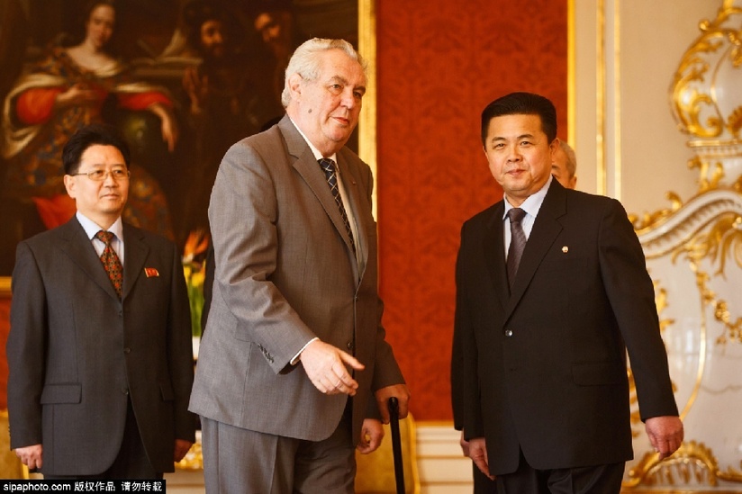 当地时间2015年1月29日,捷克布拉格,朝鲜已故领导人金正日同父异母的弟弟金平日正式上任朝鲜驻捷克大使,当日与捷克总统 Milos Zeman会面。
