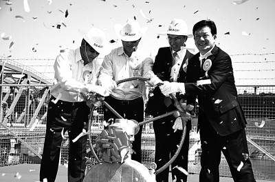中缅双方代表在马德岛港泵站前开启进油阀门。本报记者 汤先营摄