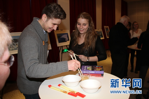 使馆还组织了写毛笔字和用筷子夹黄豆等趣味活动,很受学生欢迎,不少人都留下“墨宝”。