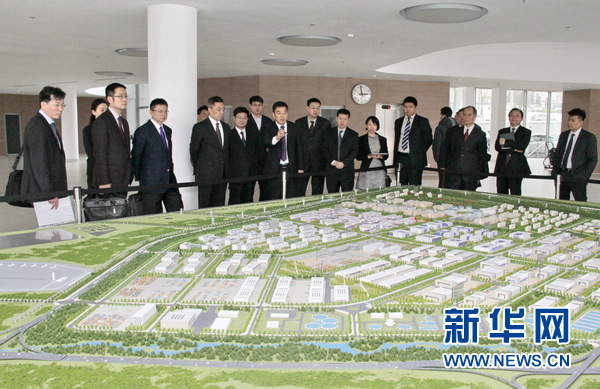 中国代表团在明斯克中白工业园管委会办公楼大厅观看工业园沙盘(前排左四为中国商务部部长助理、中白工业园协调工作组副组长张向晨,左五为中国驻白俄罗斯大使崔启明)新华网记者陈俊锋摄