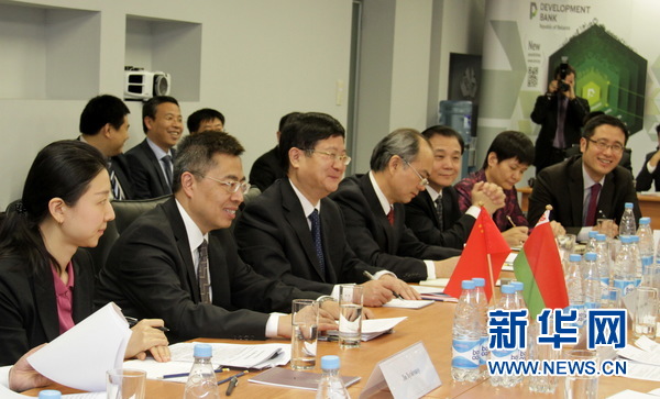 中国商务部部长助理、中白工业园协调工作组中方副组长张向晨(前排左二),中国驻白俄罗斯大使崔启明(前排左三),国资委规划发展局局长邓志雄(前排左四)在会议中。新华网记者陈俊锋摄