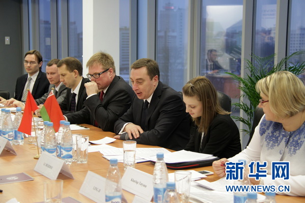 白俄罗斯总统办公厅副主任、中白工业园协调工作组白方组长斯诺普科夫(右三)在会议中。新华网记者陈俊锋摄