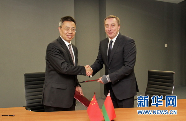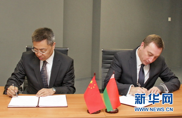 中国商务部部长助理、中白工业园协调工作组中方副组长张向晨和白俄罗斯总统办公厅副主任、中白工业园协调工作组白方组长斯诺普科夫签署会议纪要。新华网记者陈俊锋摄