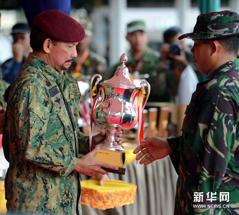 文莱苏丹给获得第11届文莱国际武器实用技能比武大赛总冠军的印度尼西亚军队代表队颁奖。新华社记者郑捷摄