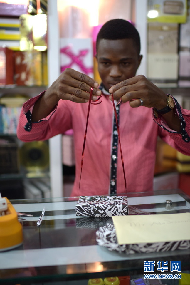 店员维克多正在给顾客包装礼品。新华社记者杨旸 摄