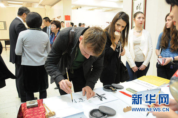 一名罗马尼亚青年体验中国书法。新华网记者 林惠芬 摄