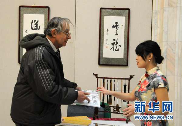 对中国书法充满好奇的罗马尼亚老人。新华网记者 林惠芬 摄