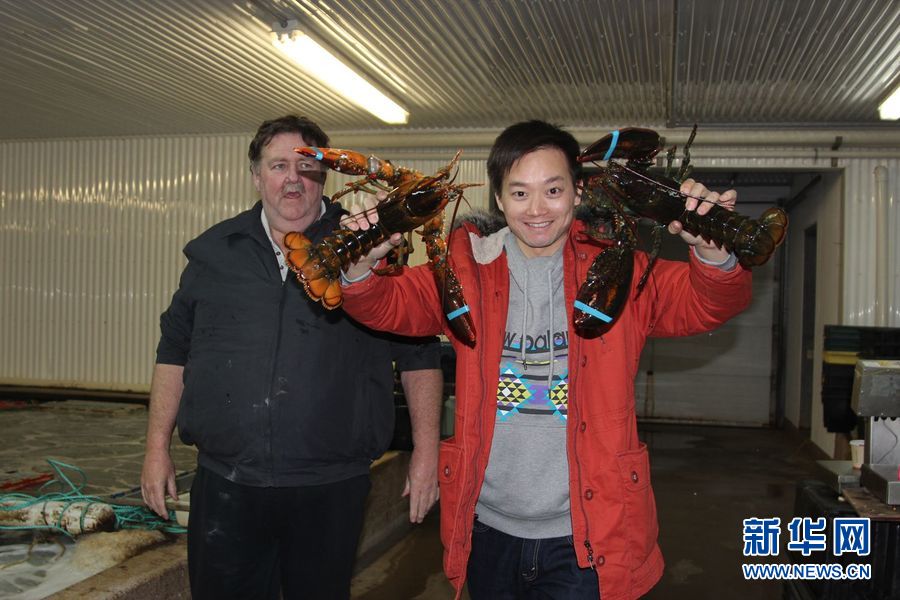 图为加拿大爱德华王子岛省的当地知名水产公司皇家之星食品公司总经理弗兰西斯·莫里西向记者展示个头比较大的鲜活龙虾。新华社记者曾德金摄