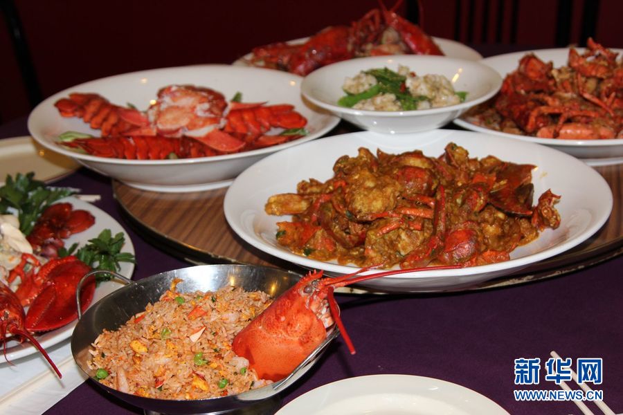 加拿大新斯科舍省哈利法克斯市的华人大厨孟繁之和他烹饪的龙虾大餐。新华社记者晏忠华摄
