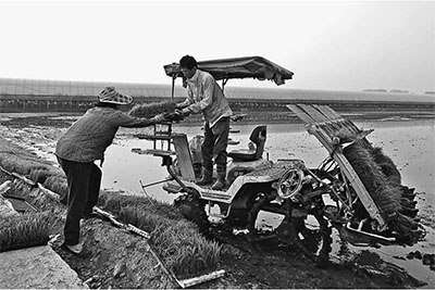 现代技术的使用极大地提高了韩国农业竞争力。图为在韩国金堤市的稻田边,农民将水稻幼苗放到移植机上。(人民视觉)