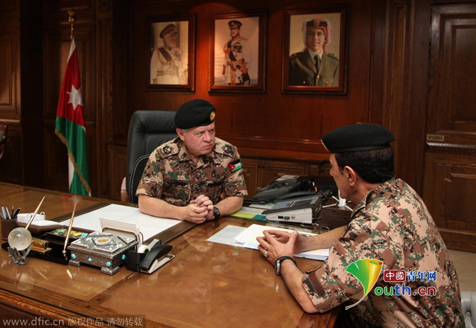 当地时间2015年2月5日公布的图片,约旦战机准备从一空军基地起飞,将对叙利亚境内的极端组织“伊斯兰国”进行空袭,严厉回击极端组织杀害约旦飞行员。图片署名:JORDAN NEWS AGENCY HANDOUT/东方IC