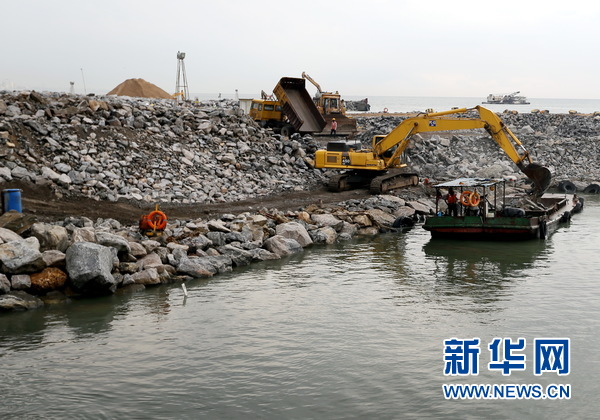 一辆挖掘机正为一艘特种铁船装载石料。新华网记者黄海敏摄