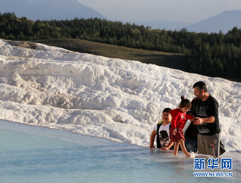 土耳其棉花堡景区内家长戴着自己的孩子来体验独特的钙化温泉,小姑娘很开心,而小伙子因为光脚踩在凹凸不平的岩层表面而表情痛苦。新华社记者邹乐 摄