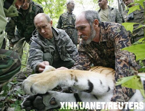 2008年8月31日,在俄罗斯远东地区,普京在科学家的帮助下为一只5岁的老虎戴上项圈。普京当日访问西伯利亚虎保护区时,一只掉入陷阱的西伯利亚虎突然蹿出,扑向附近的摄影师们,普京抓过一把用于麻醉的气枪射击,射中老虎肩胛处。虎中弹入睡后,普京亲手为虎戴上装备全球定位系统的项圈,以便科研人员监控它的动向和健康状况。 >>>详细