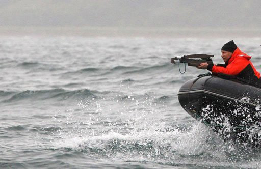 在勘察加半岛外波浪起伏的海面上,普京手持劲弩稳稳地伏在快速行进的橡皮艇边上,他用特别设计的、用于收集鲸鱼皮肤样本的飞镖,准确击中灰鲸目标。身穿黑橙相间防水服、头戴黑色休闲帽的普京,在船上对着摄像机高声欢呼道:“我在第四次尝试中射中了它。” 一名陪着普京的生物学家展示了鲸鱼皮样本,它有助于让专家们了解这条鲸鱼来自哪里。 >>>详细