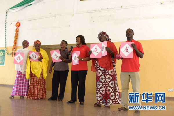 来自阿布贾教育研究中心的6名汉语学员合唱中文歌曲《朋友》。新华网记者 杨旸 摄