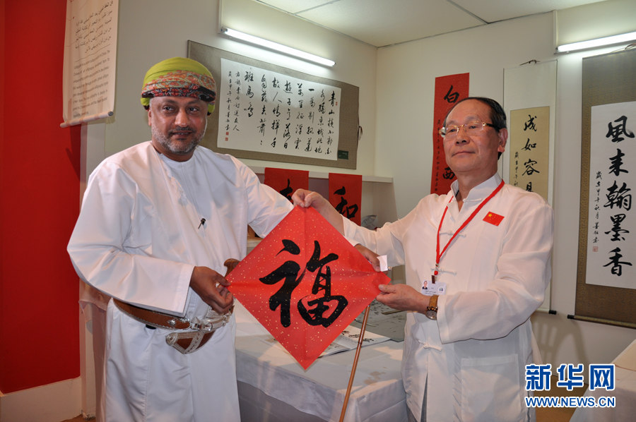 中国书法家李墨耘(右)将亲手书写的福字赠送给阿曼嘉宾。新华网记者 孙磊 摄