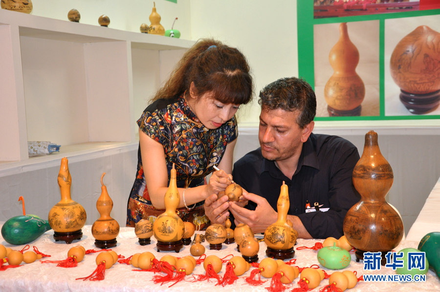 中国传统手工艺人王晓琦(左)向来宾展示葫芦雕刻技艺。新华网记者 孙磊 摄
