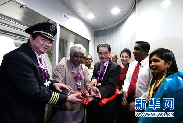 2月10日晚,中国驻斯里兰卡大使吴江浩(前中)及斯里兰卡民航交通部部长阿朱纳•拉纳通加(左二)为国航成都至科伦坡首航庆祝仪式剪彩。当晚,国航首航飞抵科伦坡,标志国航成都至科伦坡直飞航线正式开通。这是继加德满都、孟买、卡拉奇后,国航开通的第四条成都至南亚地区的直达航线。新华网记者 黄海敏 摄