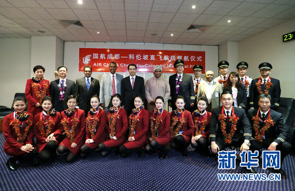 2月10日,出席国航成都至科伦坡首航庆祝仪式贵宾同机组人员合影。当晚,国航首航飞抵科伦坡,标志国航成都至科伦坡直飞航线正式开通。这是继加德满都、孟买、卡拉奇后,国航开通的第四条成都至南亚地区的直达航线。新华网记者黄海敏摄