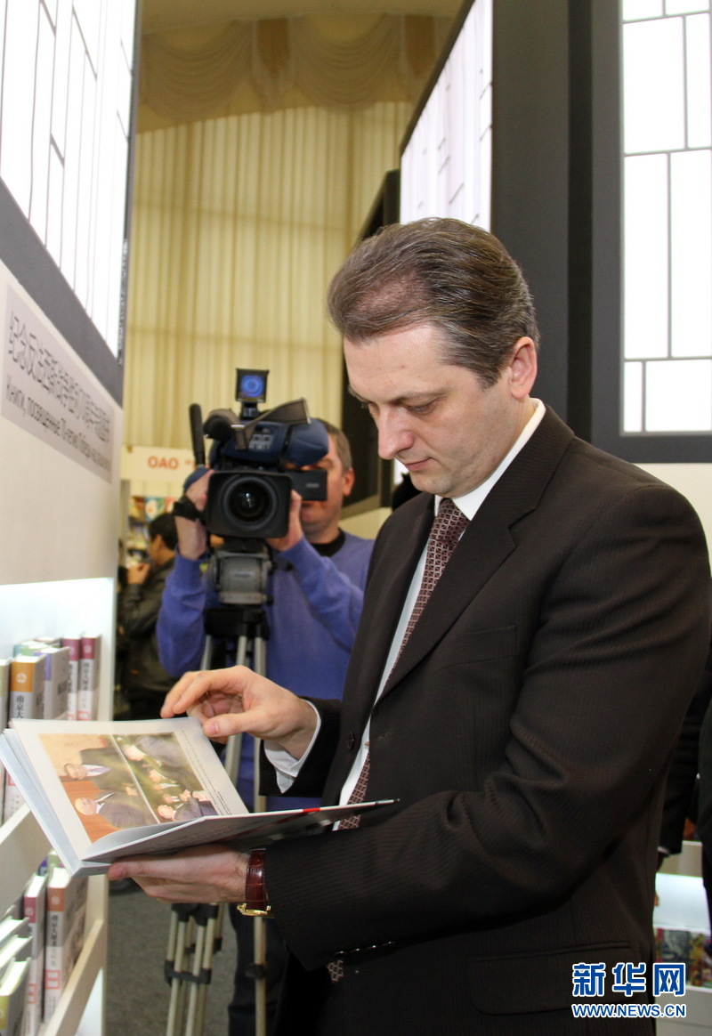 白总统办公厅副主任布佐夫斯基在中国展台翻阅抗战图书。新华社记者 陈俊锋 摄