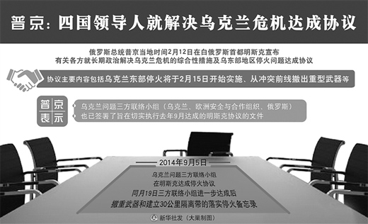 乌克兰、俄罗斯、德国、法国领导人当地时间11日晚在白俄罗斯首都明斯克独立宫开始举行关于乌克兰危机问题的会谈。经过16小时的马拉松式谈判,有关各方就长期政治解决乌克兰危机的综合性措施及乌东部地区停火问题达成协议。协议主要内容包括乌克兰东部停火将于15日开始实施、从冲突前线撤出重型武器等。