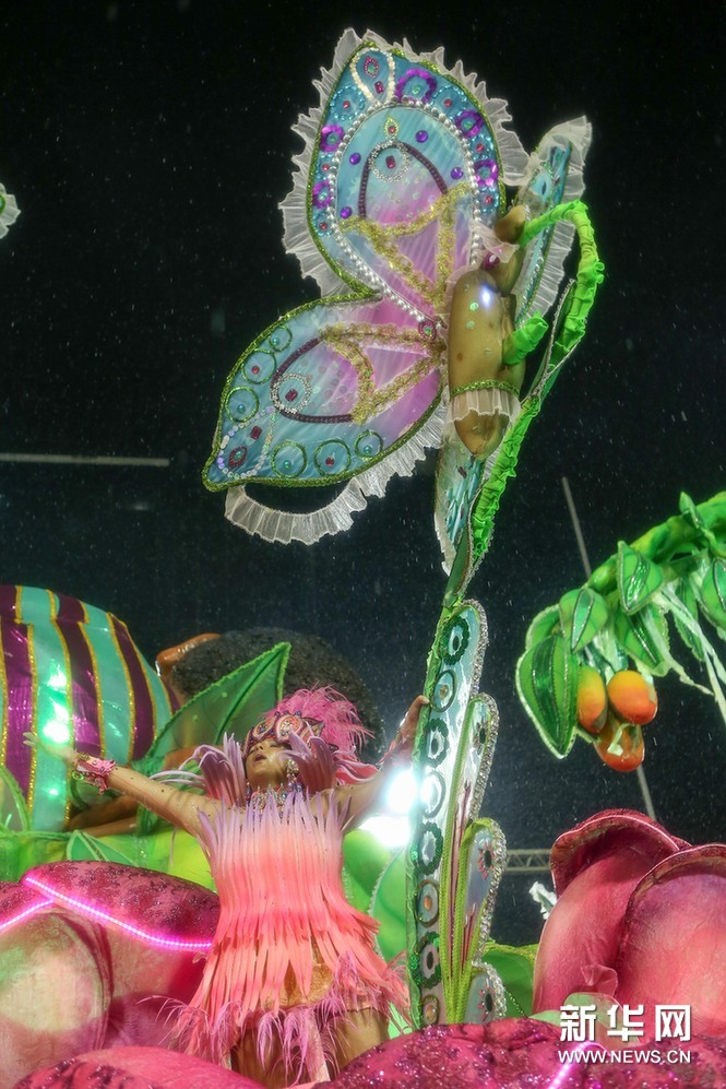 2月15日,在巴西里约热内卢桑巴大道,一名表演者参加狂欢节游行。当日是里约热内卢本年度狂欢节特级组舞校巡游的第一天,虽然全程大雨倾盆,但演员和观众的热情丝毫未减。 新华社记者徐子鉴摄