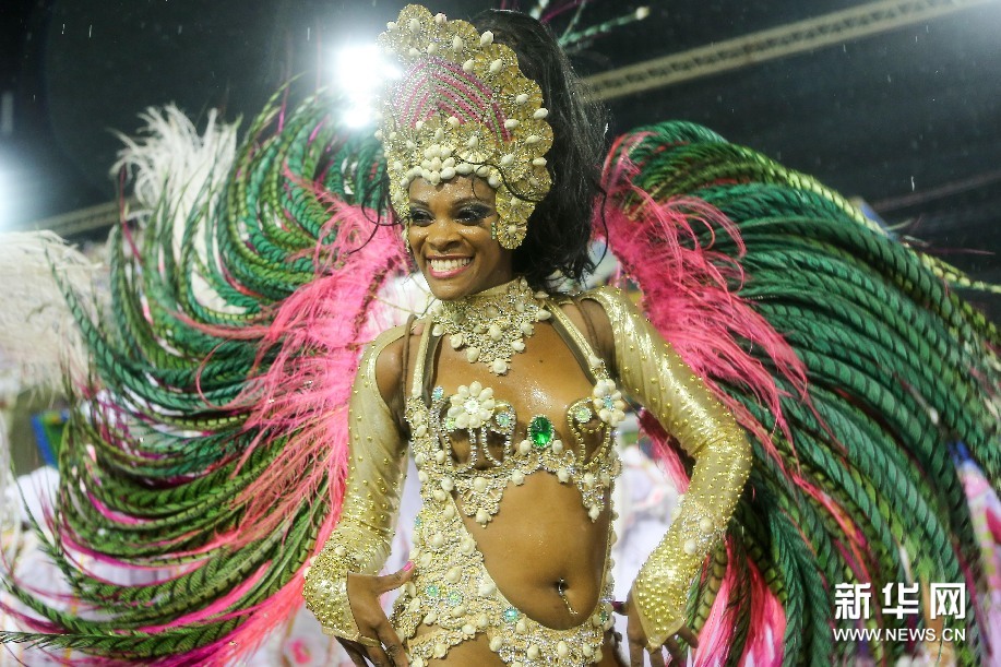 2月15日,在巴西里约热内卢桑巴大道,一名表演者参加狂欢节游行。当日是里约热内卢本年度狂欢节特级组舞校巡游的第一天,虽然全程大雨倾盆,但演员和观众的热情丝毫未减。 新华社记者徐子鉴摄