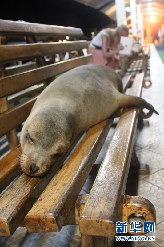 一只海狮睡在圣克鲁斯(Santa Cruz)岛码头的长椅上。