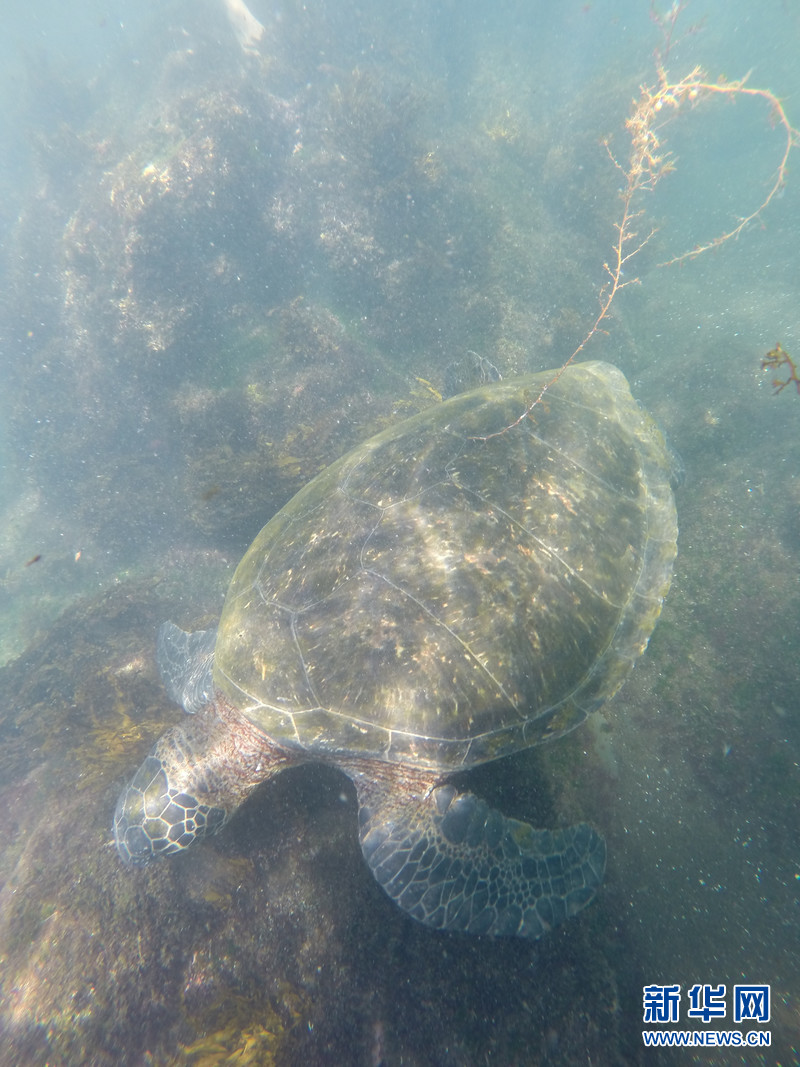 一只海龟在位于加拉帕戈斯群岛东部的圣克里斯托巴(San Cristobal)岛附近的海水中潜泳。