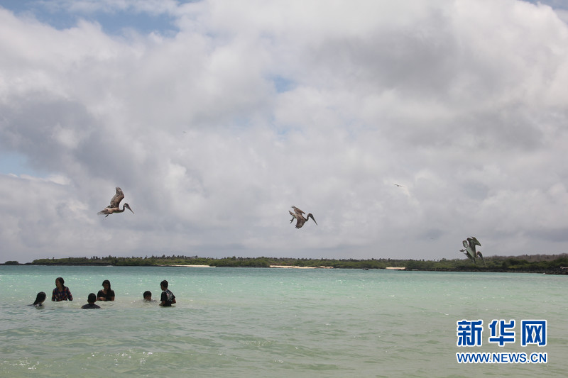 加拉帕戈斯群岛中部的圣克鲁斯(Santa Cruz)岛上,数只鹈鹕在捕食,人们在水中嬉戏,相处和谐。