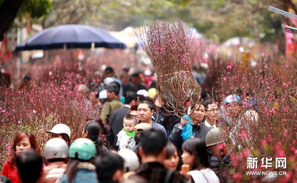 资料图片:每到春节来临之际,越南民众会在节前到花市购买桃花枝摆放在家里,以求新年有好运。 新华社/越通社
