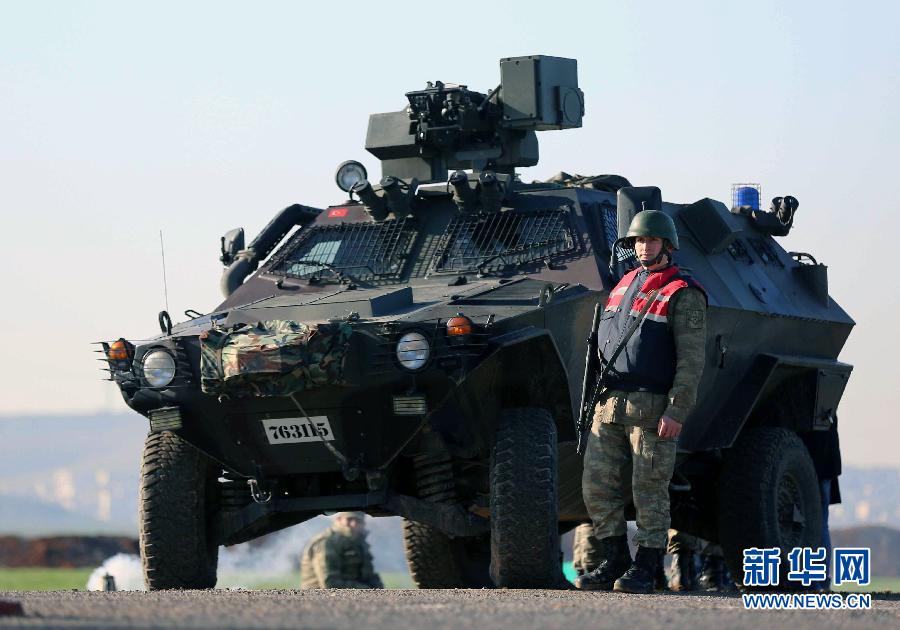 2月22日,在叙利亚境内,一名土耳其士兵在行动中站在装甲车旁。新华社发