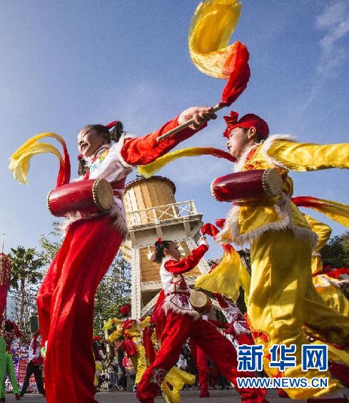 新华网洛杉矶2月21日电(记者薛颖)21日,在美国加利福尼亚州迪士尼冒险乐园,一群9至11岁的中国陕北少年欢快地打着腰鼓、扭着秧歌,红色、黄色、绿色的民族传统服饰在明媚的阳光下格外鲜艳,嘹亮的陕北民歌乐曲吸引了大量游客围观。
