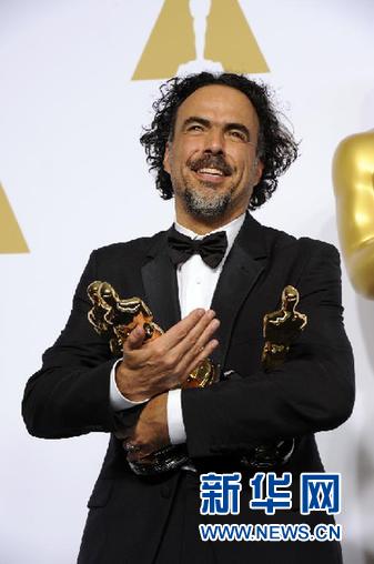 2月22日,在美国洛杉矶杜比剧院,《鸟人》导演亚历杭德罗·伊尼亚里图怀抱最佳影片、最佳导演和最佳原创剧本三个奥斯卡小金人。新华社记者杨磊摄