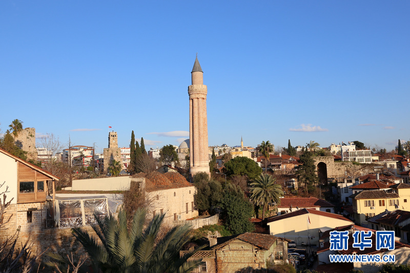 图为安塔利亚地标建筑,鉴于13世纪初期的红色尖塔(yivli minare)和卡莱伊奇(kaleici)老城区。新华社记者邹乐摄