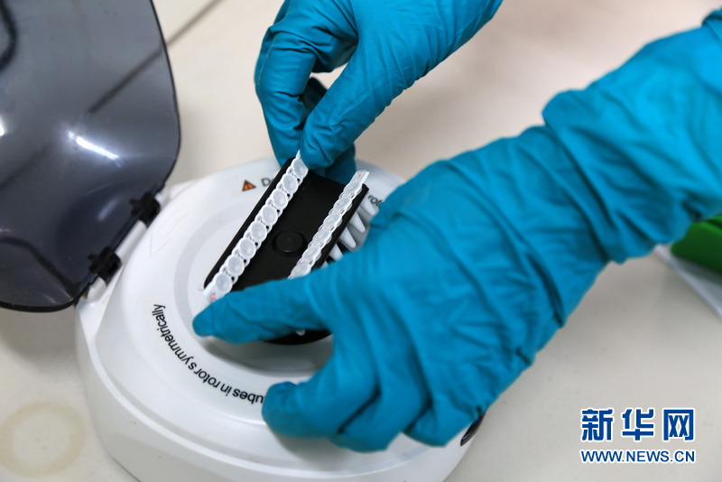队员何君将加完样本RNA模板后的PCR反应板进行短暂离心(2月19日摄)。自2014年9月以来,中国援塞移动实验室检测队先后分3批、共百余名队员来到地处西非的塞拉利昂,与致死率极高的埃博拉病毒“近身相搏”。农历羊年的第一天,也就是大年初一,队员们依旧奋战在抗埃一线,在移动式生物安全三级实验室里检测携带埃博拉病毒的血样,清晨出发,直至披星戴月时才返回三十多公里外的驻地,为塞拉利昂彻底消灭埃博拉病毒一步一个脚印地奉献。新华社发(孙鼎盛 摄)